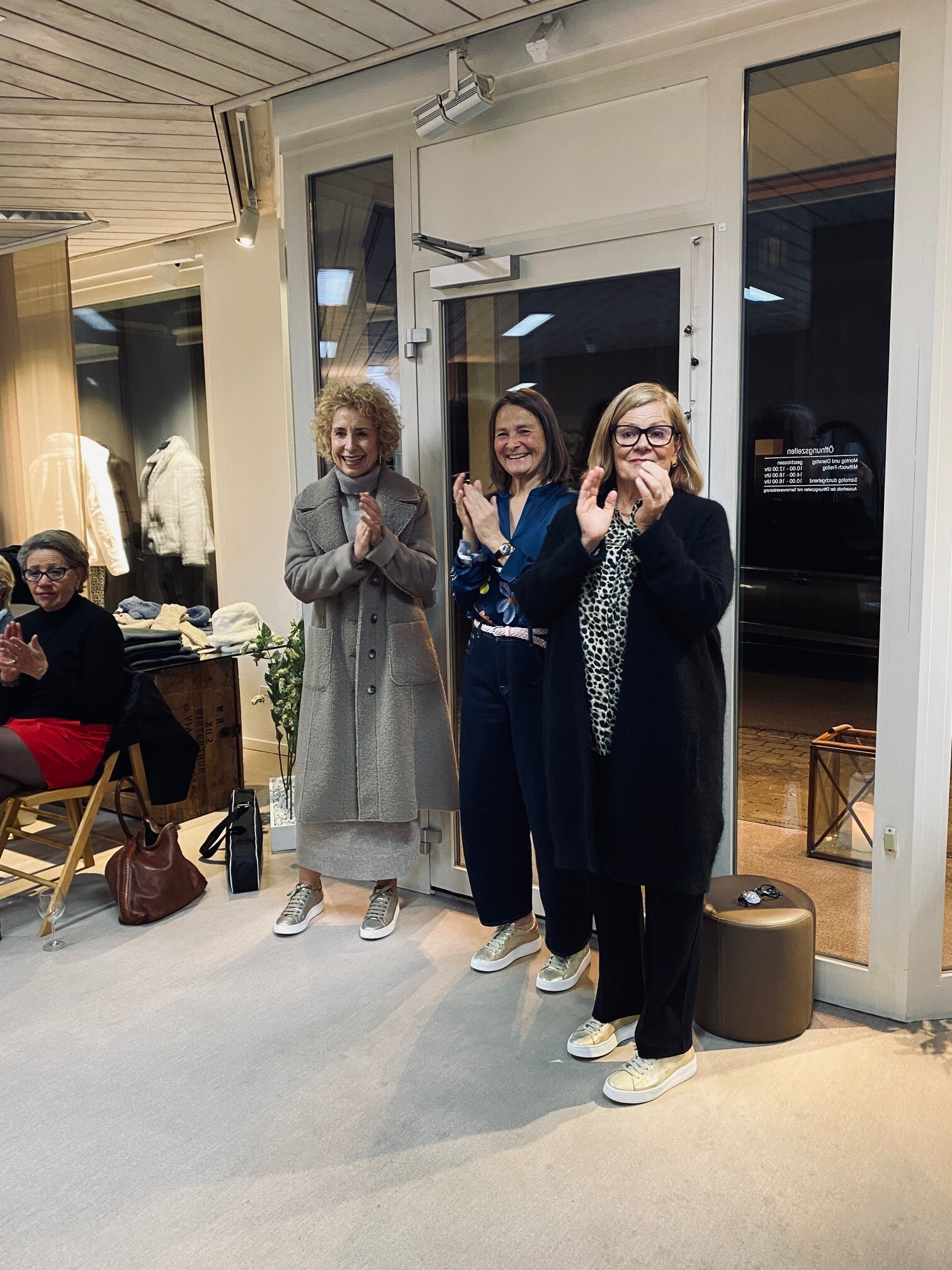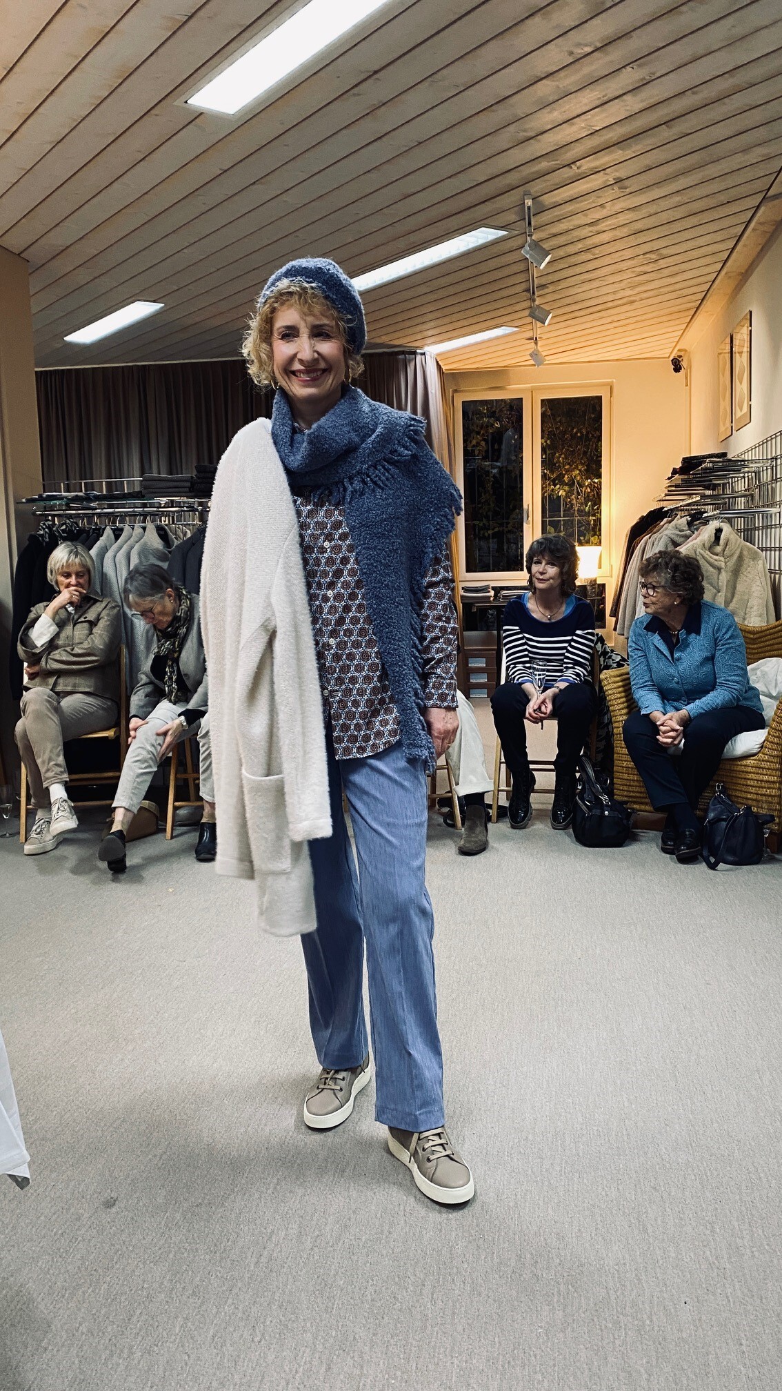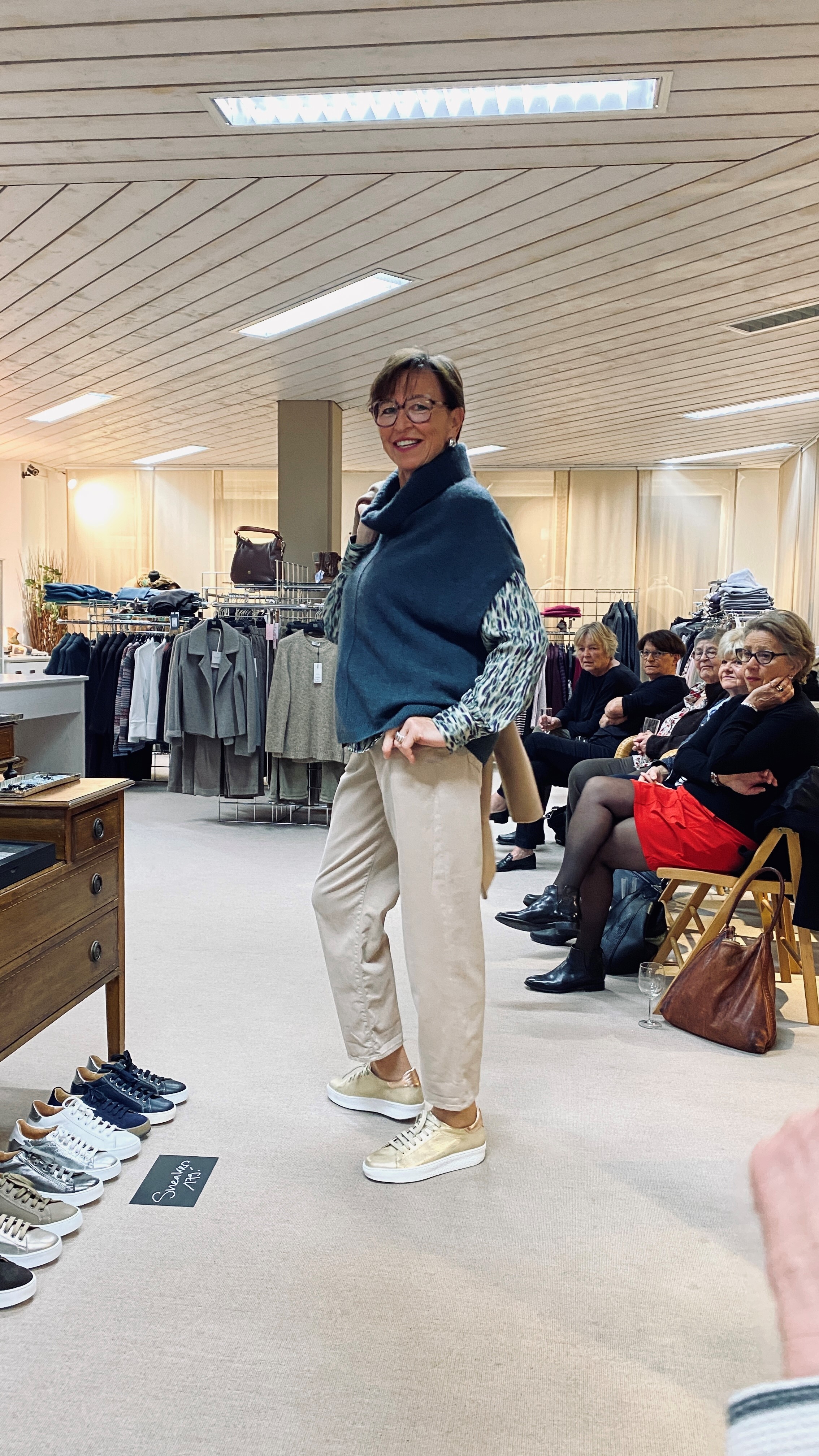Drei Geschäftsfrauen-Mannequins zeigten uns Mäntel mit Schals und Mützen und im zweiten Umgang das Darunter: Hosen in allen Formen, Pullover, Jacken und Blusen, immer farblich – Herbst- oder Wintertöne - abgestimmt, auch mit Schuhen und Taschen, und vor allem in wunderbarer Qualität. Micheline Ammann, Besitzerin und Geschäftsführerin, kommentierte die Outfits und wies darauf hin, dass vieles aus italienischen Betrieben und aus kleineren Manufakturen stamme, wo Wert auf Qualität und Herstellung gelegt werde. Und doch moderate Preise! Im Kopf haben wir uns sicher alle Gedanken gemacht, was uns gelüsten würde… was zu uns passen würde… Gut gefallen haben mir – als meist Hosen tragende Velofahrerin - auch die Jupes, die diesen Winter wieder vermehrt angeboten würden. Schaut euch die anregenden Bilder an!